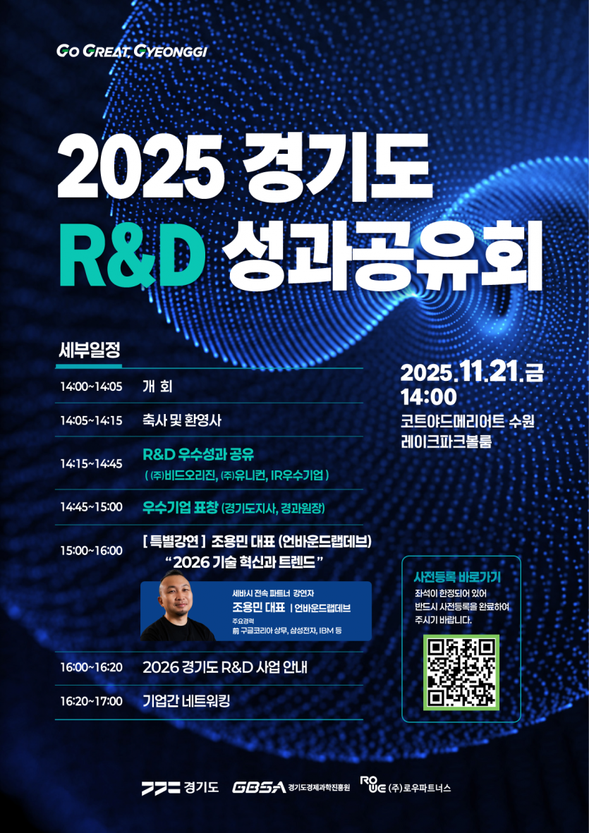 지난 1년간 개발된 우수기술의 개발과정과 성과를 공유하고 2026 기술혁신 및 트렌드 특강(조용민 前 구글코리아 상무), 차년도 사업 설명회를 개최하오니, 도내 R&D 기업의 많은 관심과 참여를 부탁드립니다.